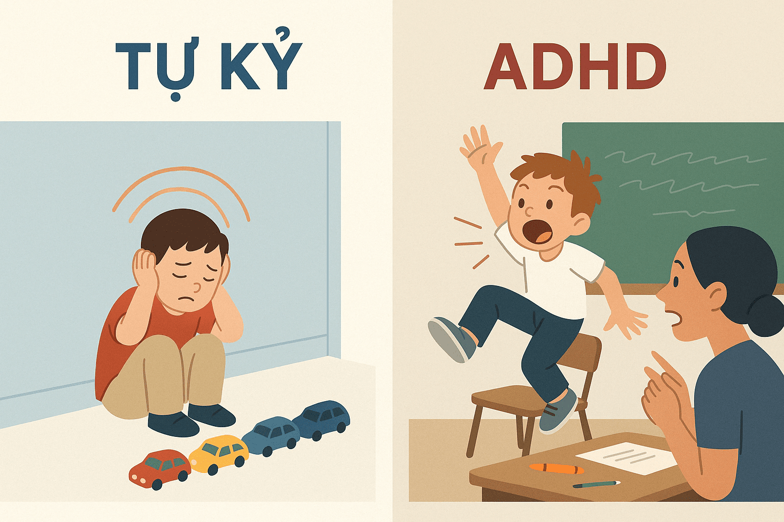Rối loạn Phổ Tự kỷ (Autism Spectrum Disorder – ASD, thường gọi tắt là tự kỷ) và Rối loạn Tăng động Giảm chú ý (Attention-Deficit/Hyperactivity Disorder – ADHD, hay tăng động giảm chú ý) đều thuộc nhóm rối loạn phát triển thần kinh. Cả hai có thể gây ảnh hưởng đến khả năng giao tiếp, chú ý và hành vi của trẻ, với một số biểu hiện bề ngoài khá giống nhau. Tuy nhiên, theo DSM-5, bản chất hai rối loạn này khác nhau: